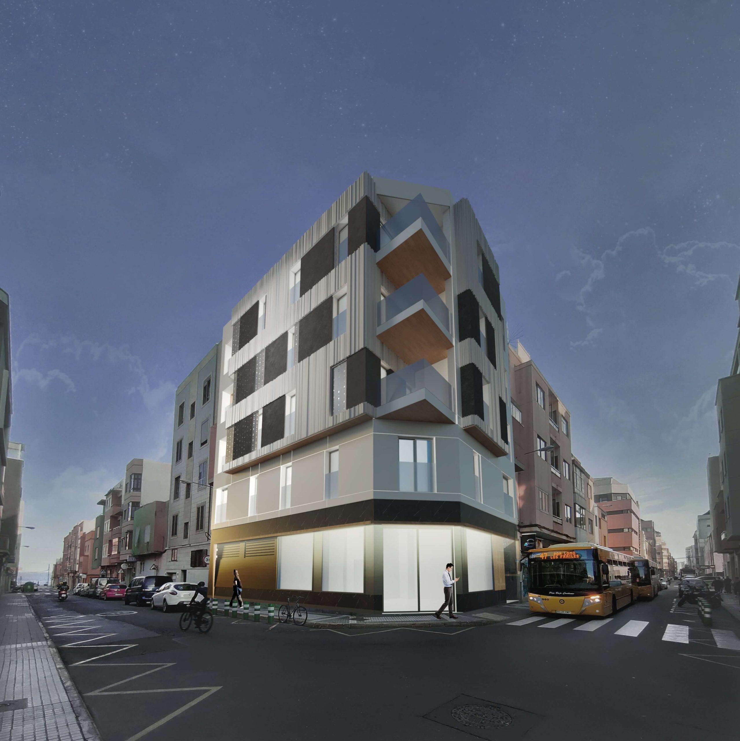 Descripción: En un barrio en constante renovación, se propone esta pieza de carácter contemporáneo, guardando una estética vanguardista. Se aprovecha su ubicación privilegiada junto la Plaza del Pilar y a escasos metros de la Playa de Las Canteras para abrir la mirada y generar un giro amable en una esquina que será el punto de partida del proyecto.