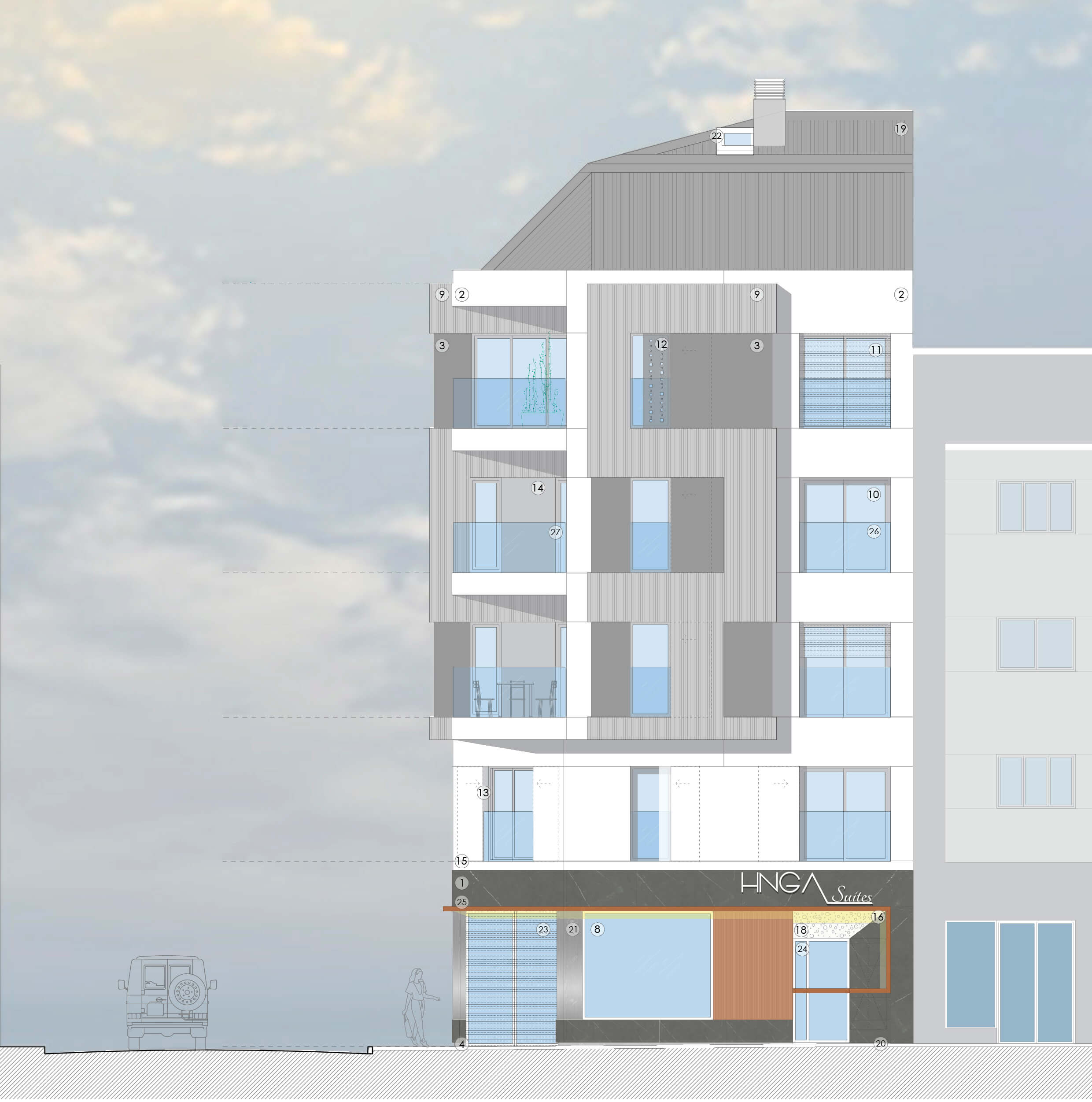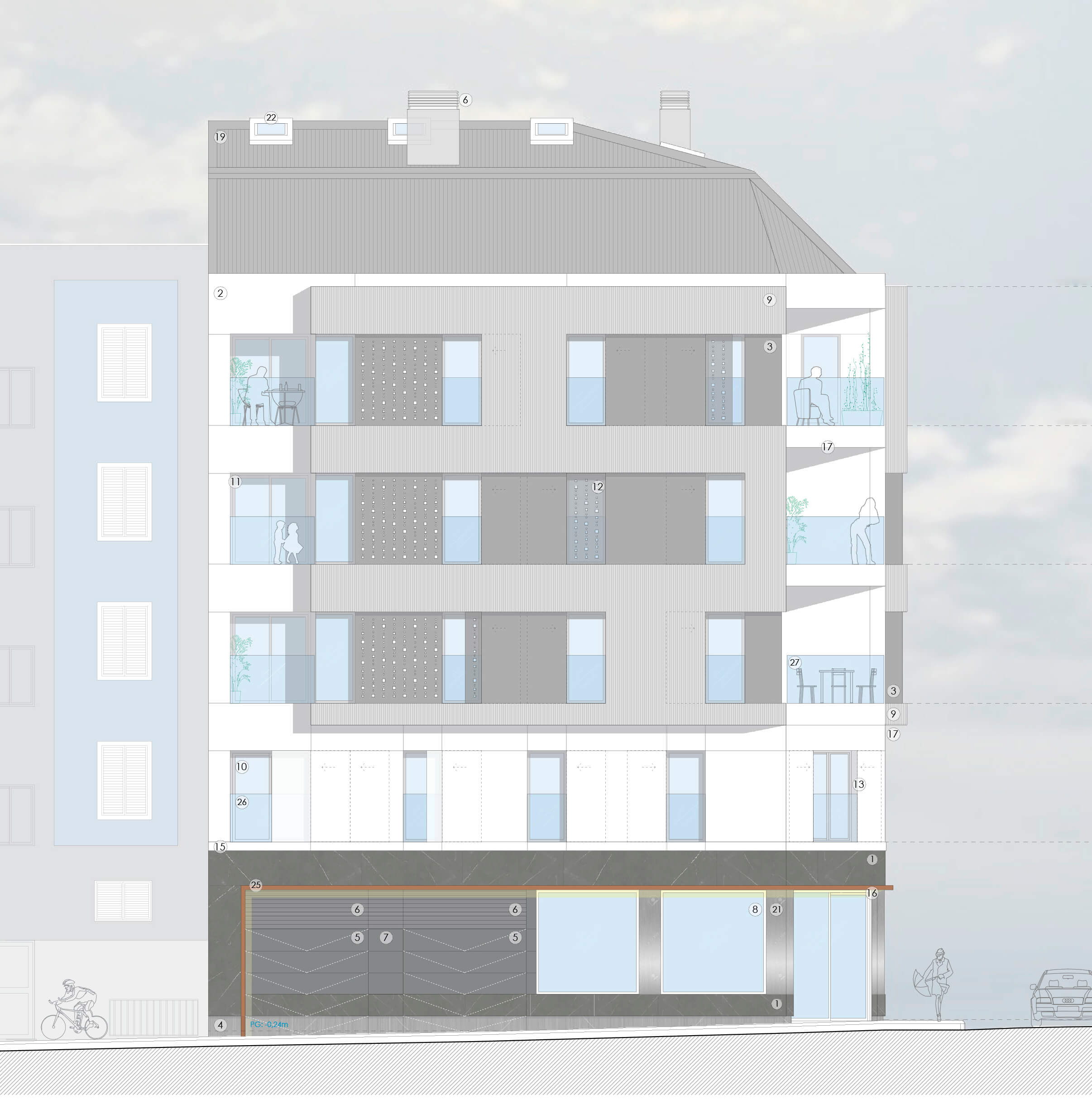 Formalmente se ha dispuesto la planta baja como un zócalo completo, mediante aplacado porcelánico y superficie acristalada. En la entrada peatonal de las viviendas se ennoblece el aspecto mediante el uso de vitacola, que a su vez es el punto de partida de una gran visera que separa este zócalo del resto del edificio. Las sombras de fachada generadas por las diferentes soluciones de fachada ventilada aportan verticalidad y dinamismo mediante grandes paneles móviles que benefician al usuario.