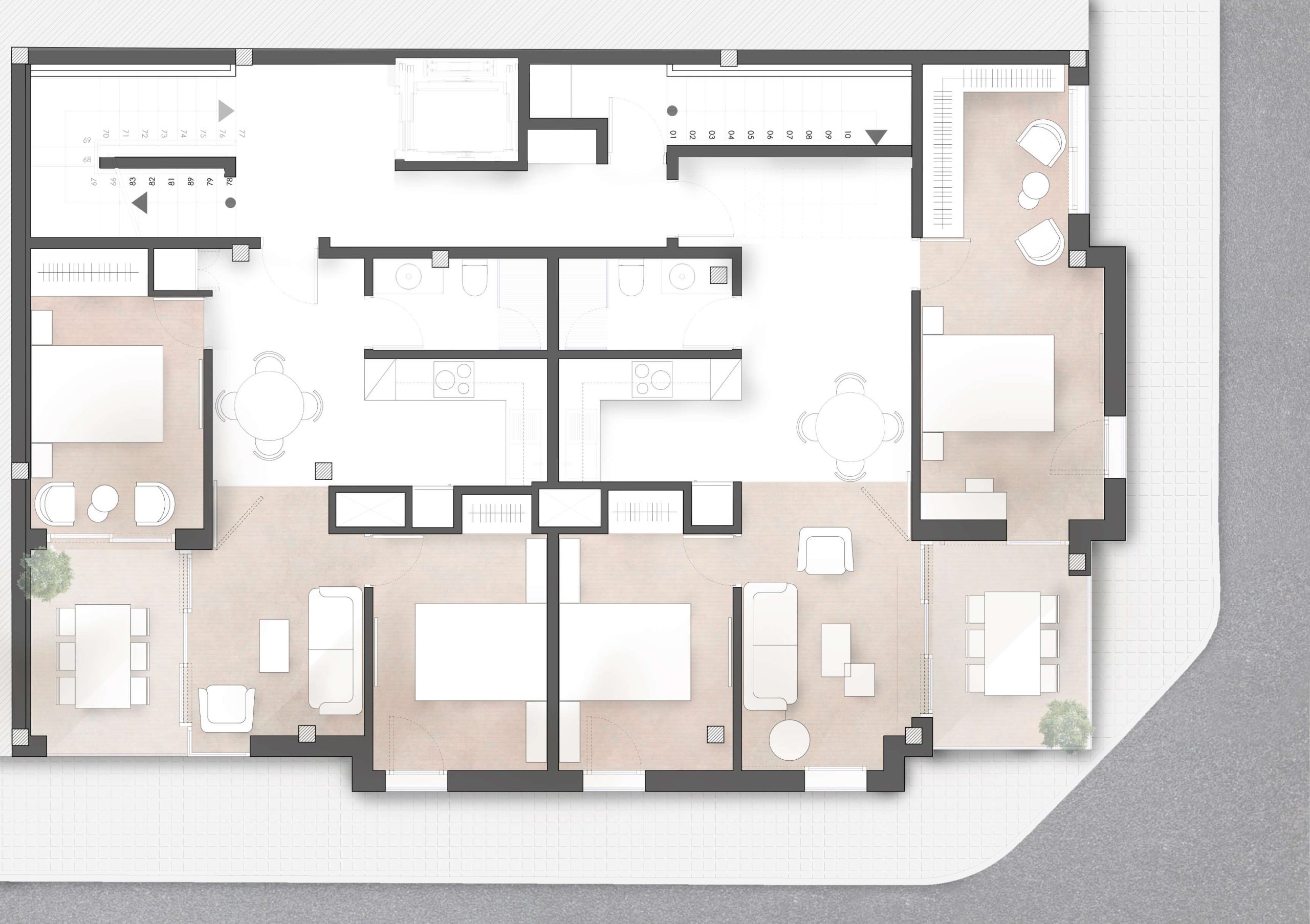 Con escasos 140m2 por planta, se proyecta un edificio de 12 viviendas, con aparcamiento y un local comercial. Considerando las dos fachadas como un único alzado, se han regalado primeras luces a todas las estancias principales de las viviendas. El núcleo de comunicaciones ubicado en la entrada de la calle Simancas, genera muy pocos espacios residuales, ganando superficie para cada una de las viviendas. El olor a mar se introduce a través de grandes ventanas y terrazas a partir de la planta segunda, donde se añaden materiales naturales como madera y vegetación abundante.